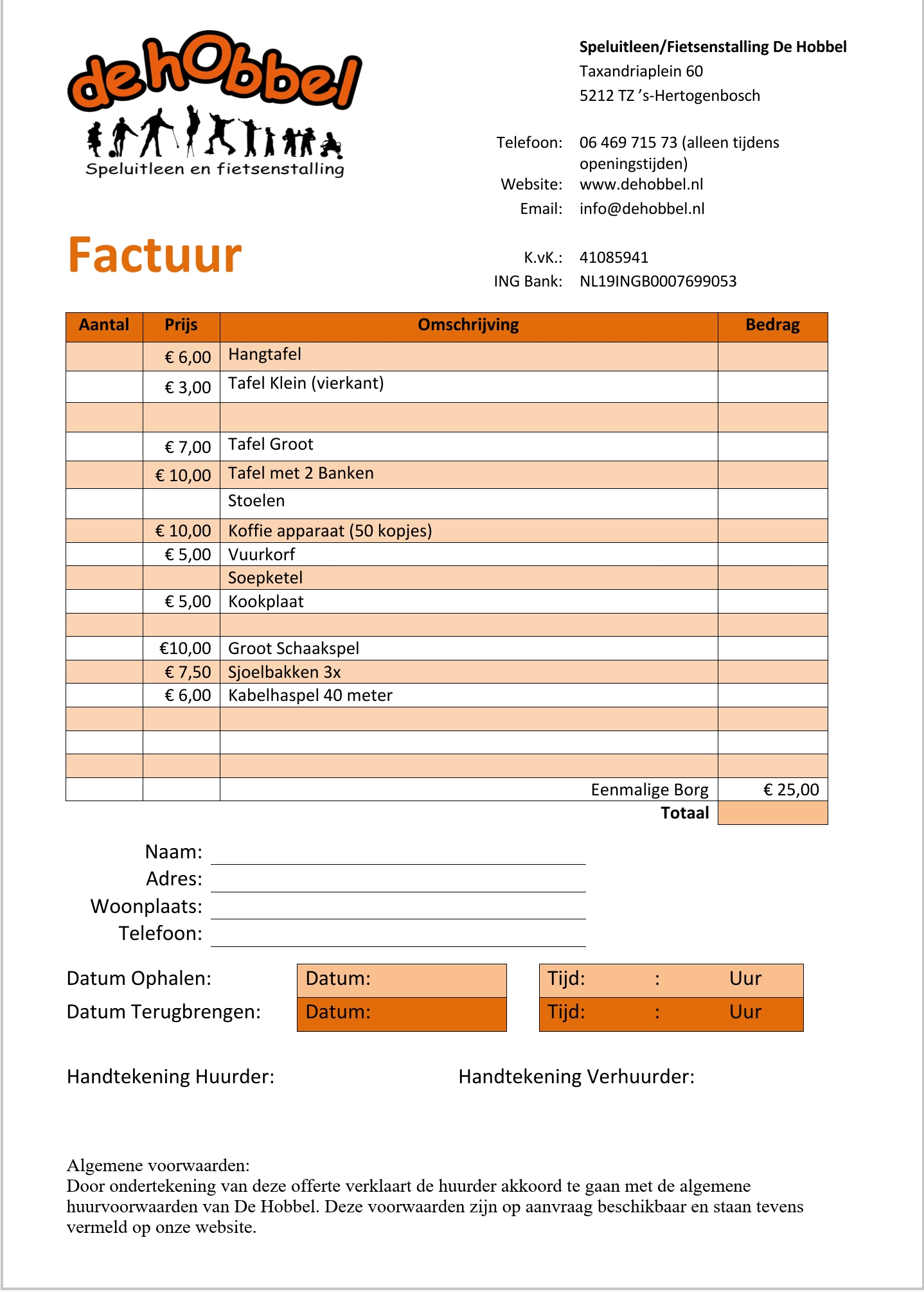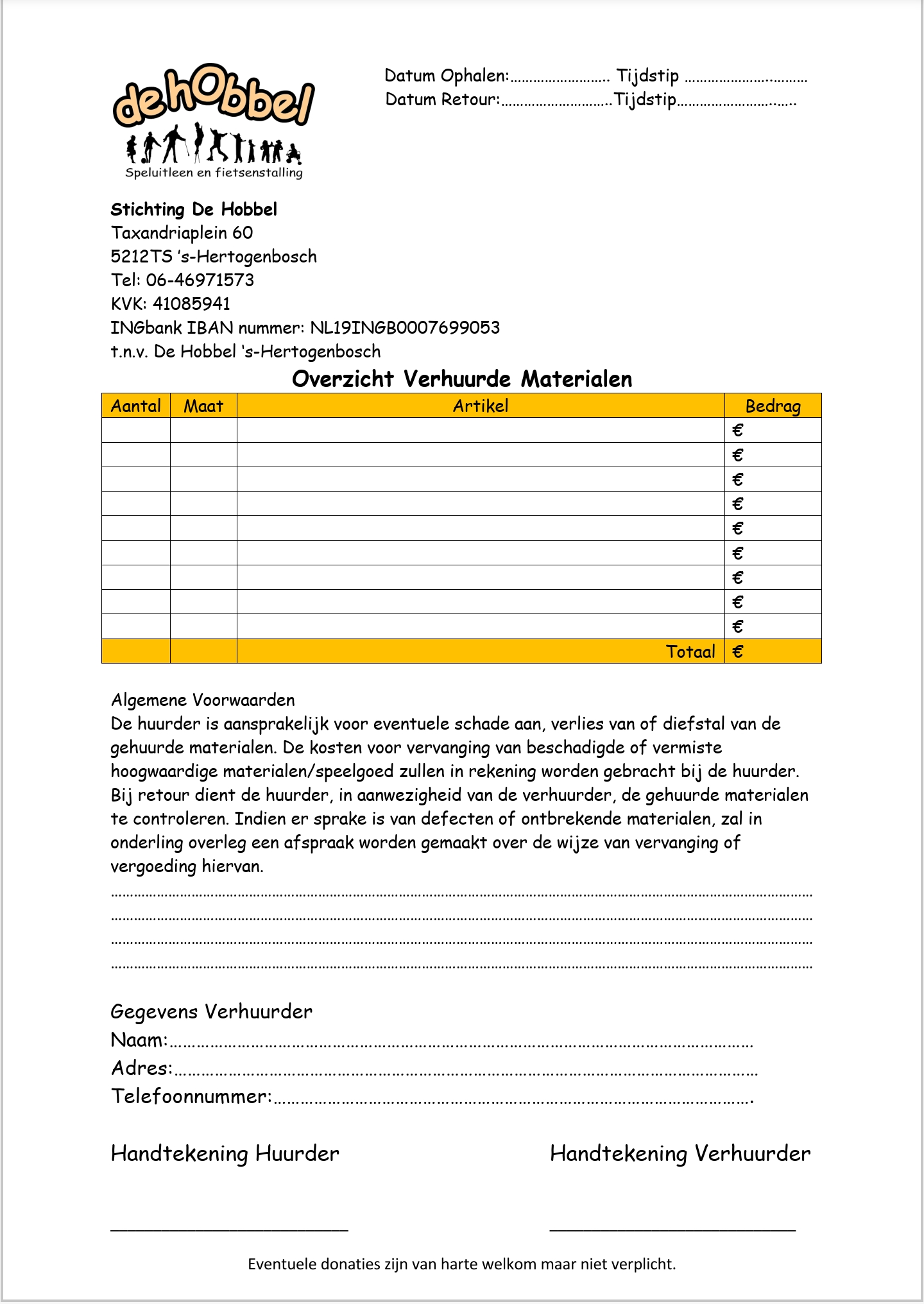 Binnenkort een feestje? Maar kom je net een paar stoelen, hangtafels, koffiezetapparaat of soepketel tekort? Ook daarvoor kan je terecht bij de Hobbel. Download hier de lijst met spullen die te huur zijn. Download hier de lijst met speelgoed die te huur zijn (de lijst moet je dan nog wel invullen. Over de prijs en beschikbaarheid, kan contact opnemen met de beheerder.